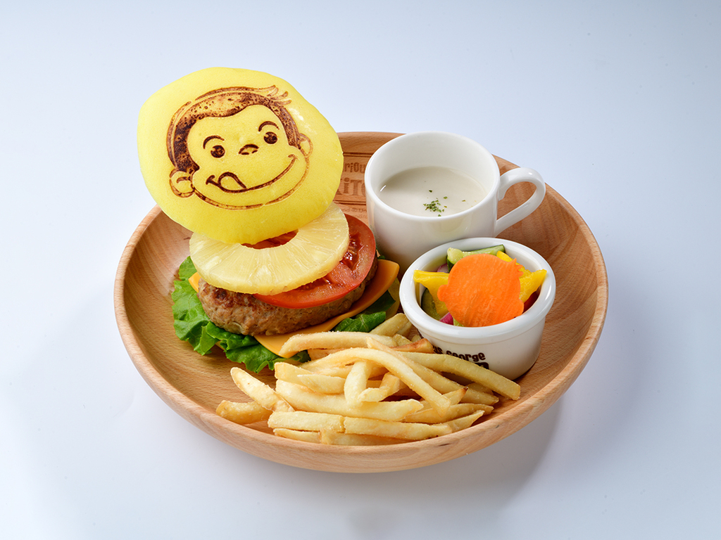 にっこり笑顔のジョージのバンズにパイナップル、トマト、 チーズが入ったトロピカルなオリジナルバーガーは夏にぴったり!ポテトフライ、自家製ピクルスやじゃがいもの冷たいスープがついてワンプレートになっています。